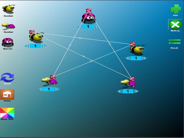 Детский калькулятор, простой в освоение, научит вашего ребёнка складывать и умножать числа. Числа с изображениями жуков и пчёл превратят изучение в интересную игру. Создание примеров осуществляется простым перетаскиванием картинок на поле, затем вам нужно выбрать действие(умножение или сложение) и соединить три картинки линией.