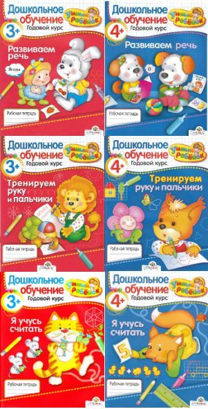 Описание: Шесть рабочих тетрадей ("Тренируем руку и пальчики", "Я учусь считать", "Развиваем речь") для детей 3-х и 4-х лет, помогут подготовить Вашего ребёнка к школе.